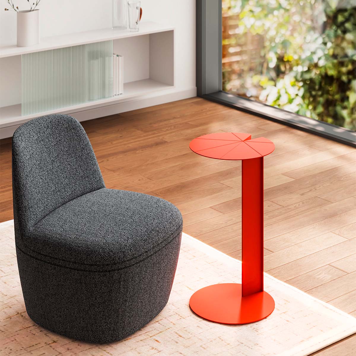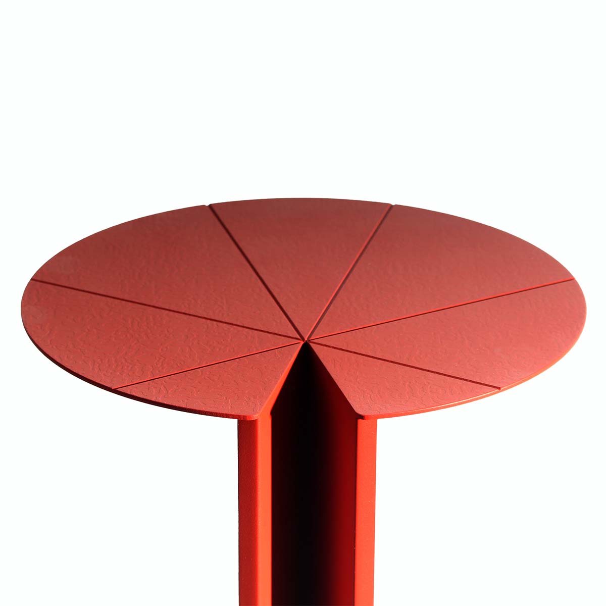 Mesa lateral con cubierta de acero con textura ligeramente repujada y base de acero.