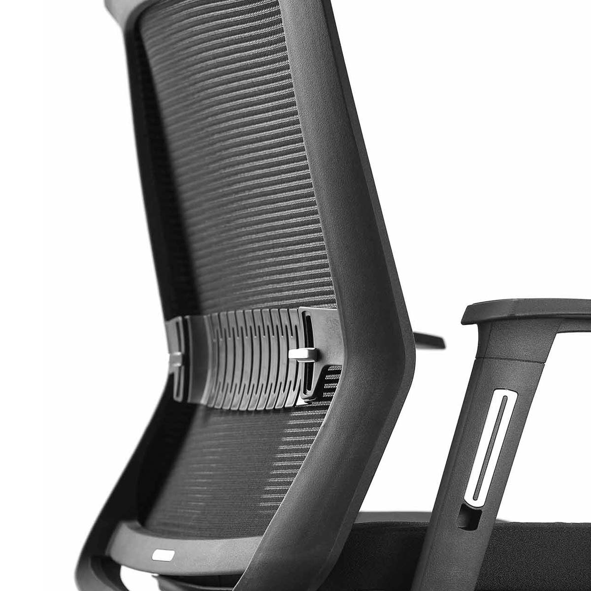 Mecanismo sincrónico con fijación en múltiples posiciones y sistema de tensión regulable. Respaldo de malla con soporte lumbar ajustable en altura.