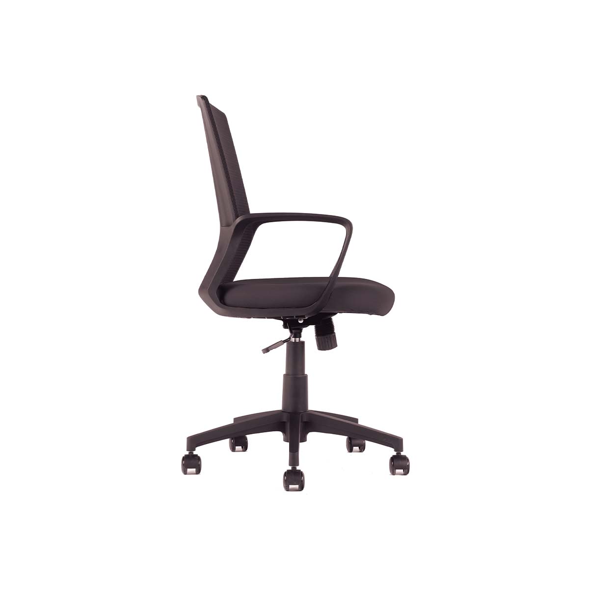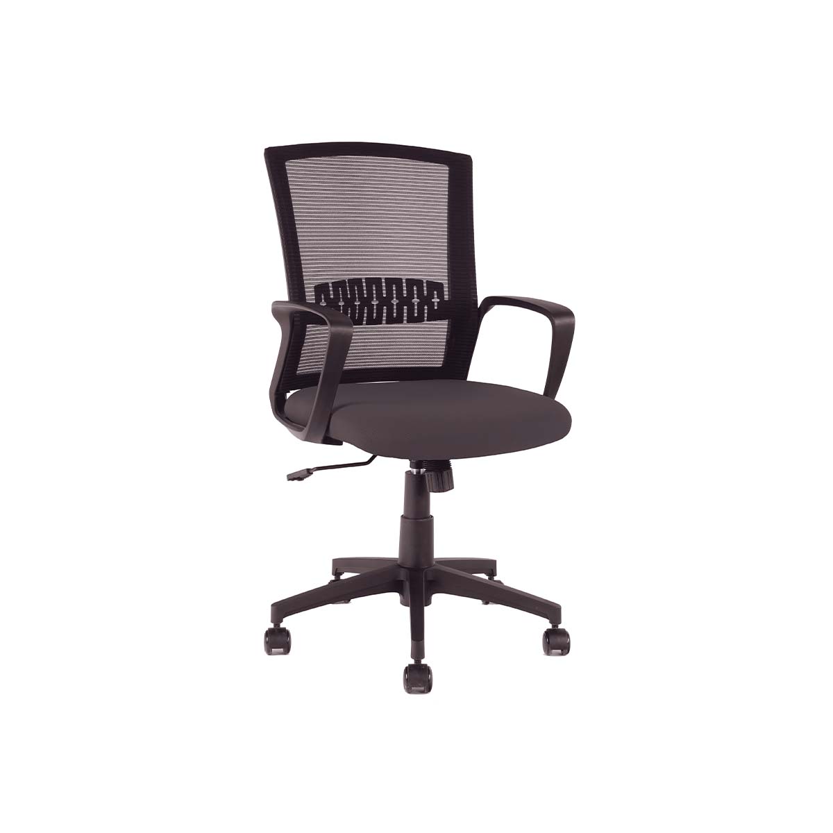 Respaldo de malla con soporte lumbar simple y apoyabrazos de PP fijos.