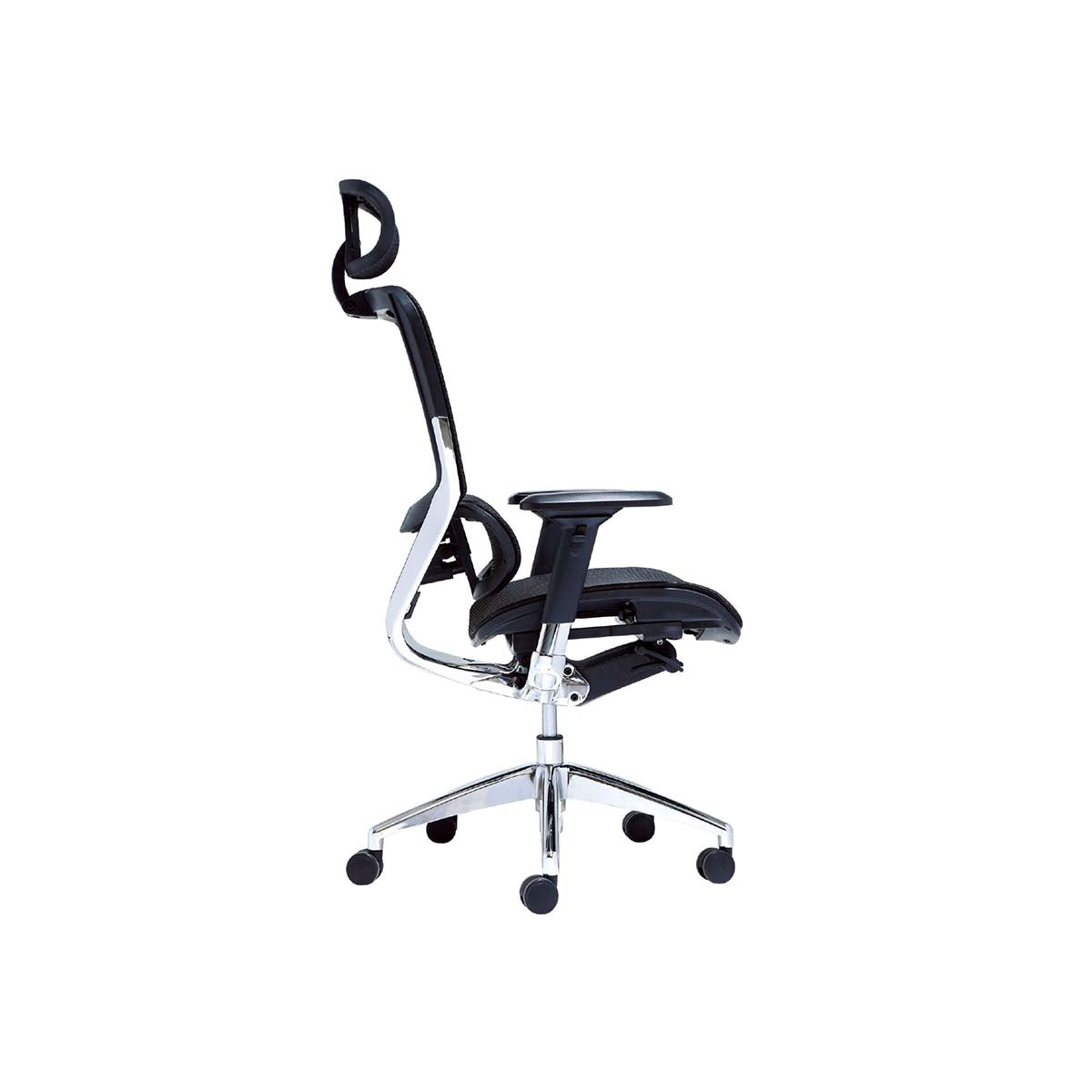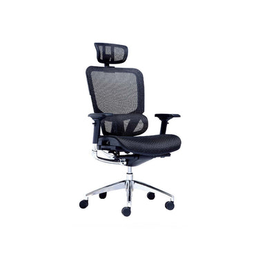 Cabecero de malla ajustable en altura y angulo, respaldo y asiento en malla Taiwán, brazos regulables PU 4D, apoyo lumbar ajustable en 3 niveles de altura, asiento con regulación de profundidad (slider), mecanismo sincrónico L de Alemania, mecanismo con 4 posiciones de bloqueo y manilla para regulación de tensión