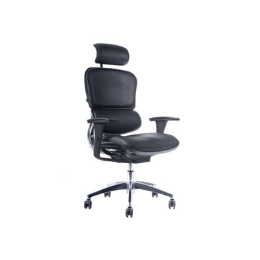 Asiento de cuero italiano con gas de 100 mm, base de aluminio 680 mm y ruedas de PU negras de 65 mm.