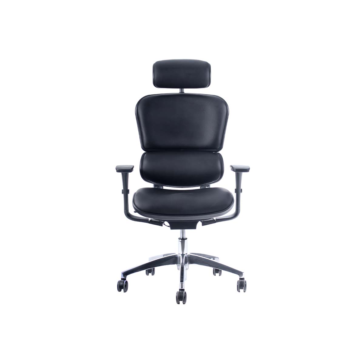 Respaldo de cuero italiano regulable en altura y soporte lumbar con ajuste de tensión.