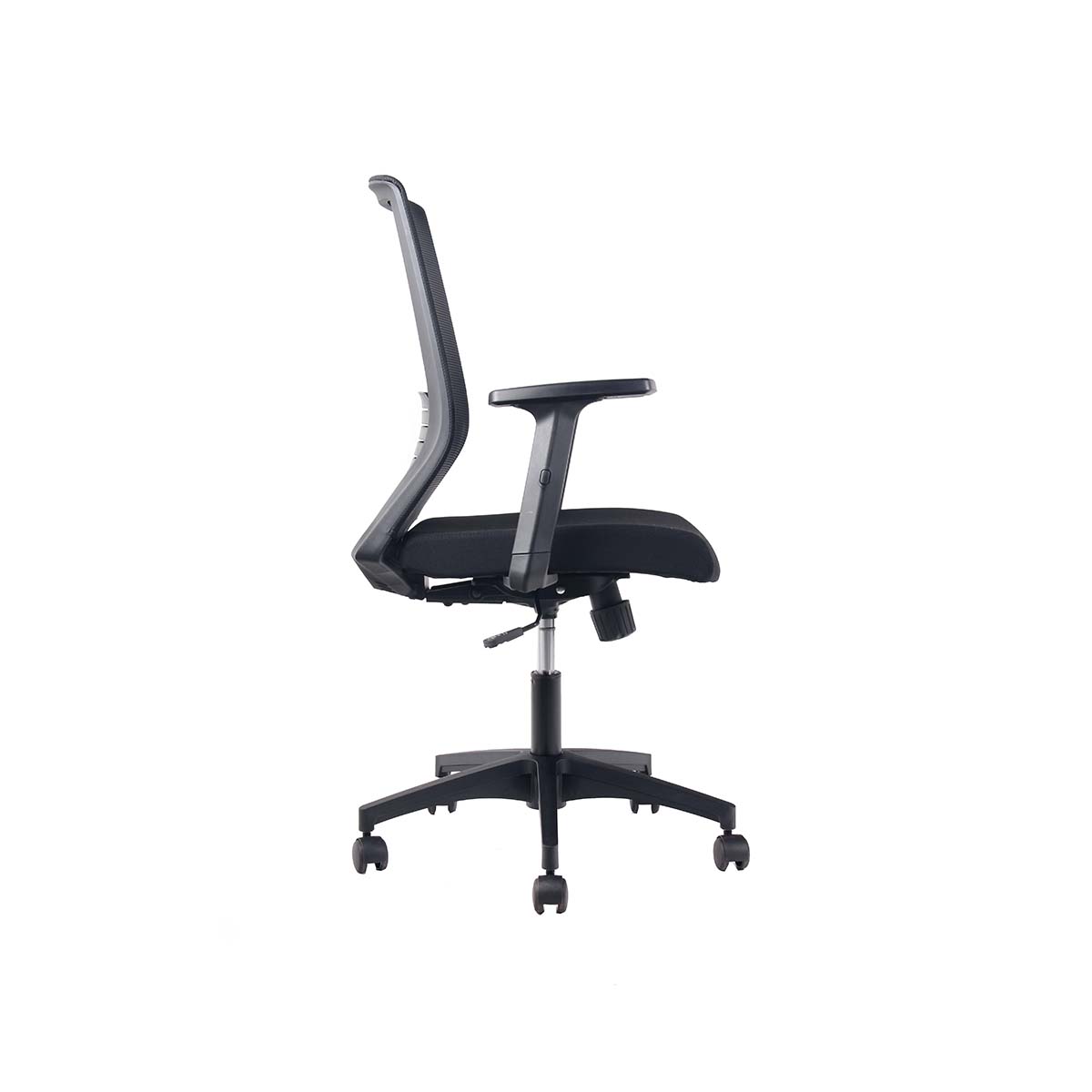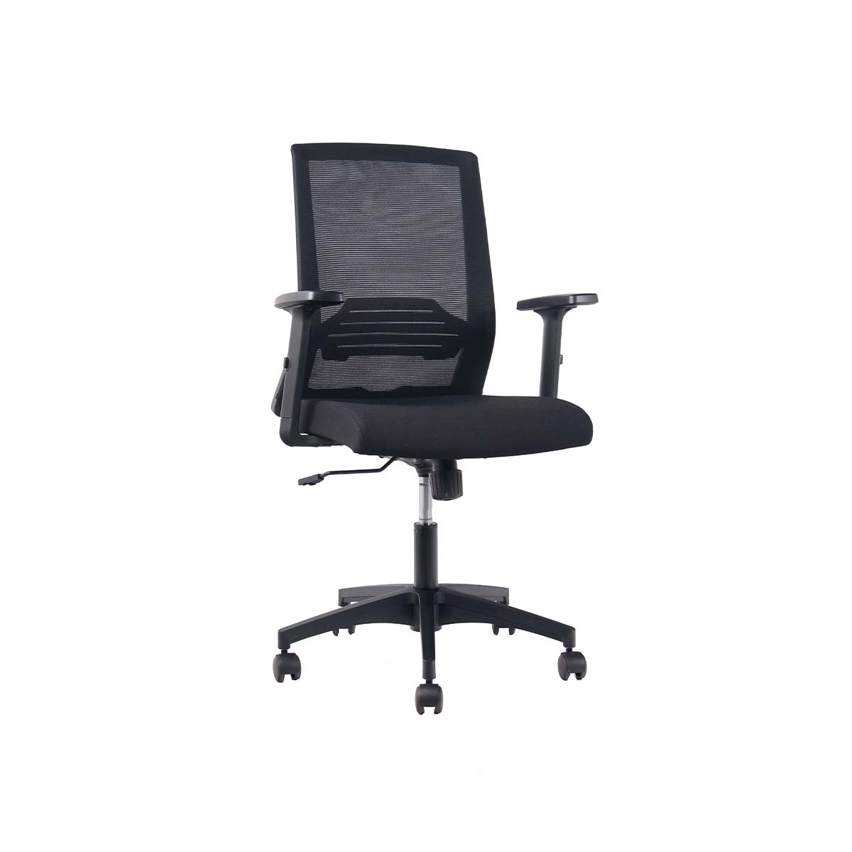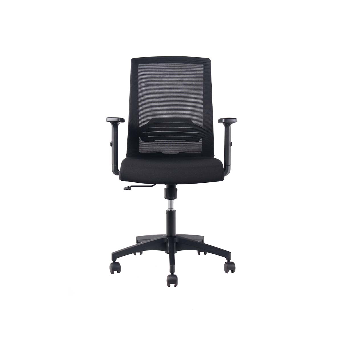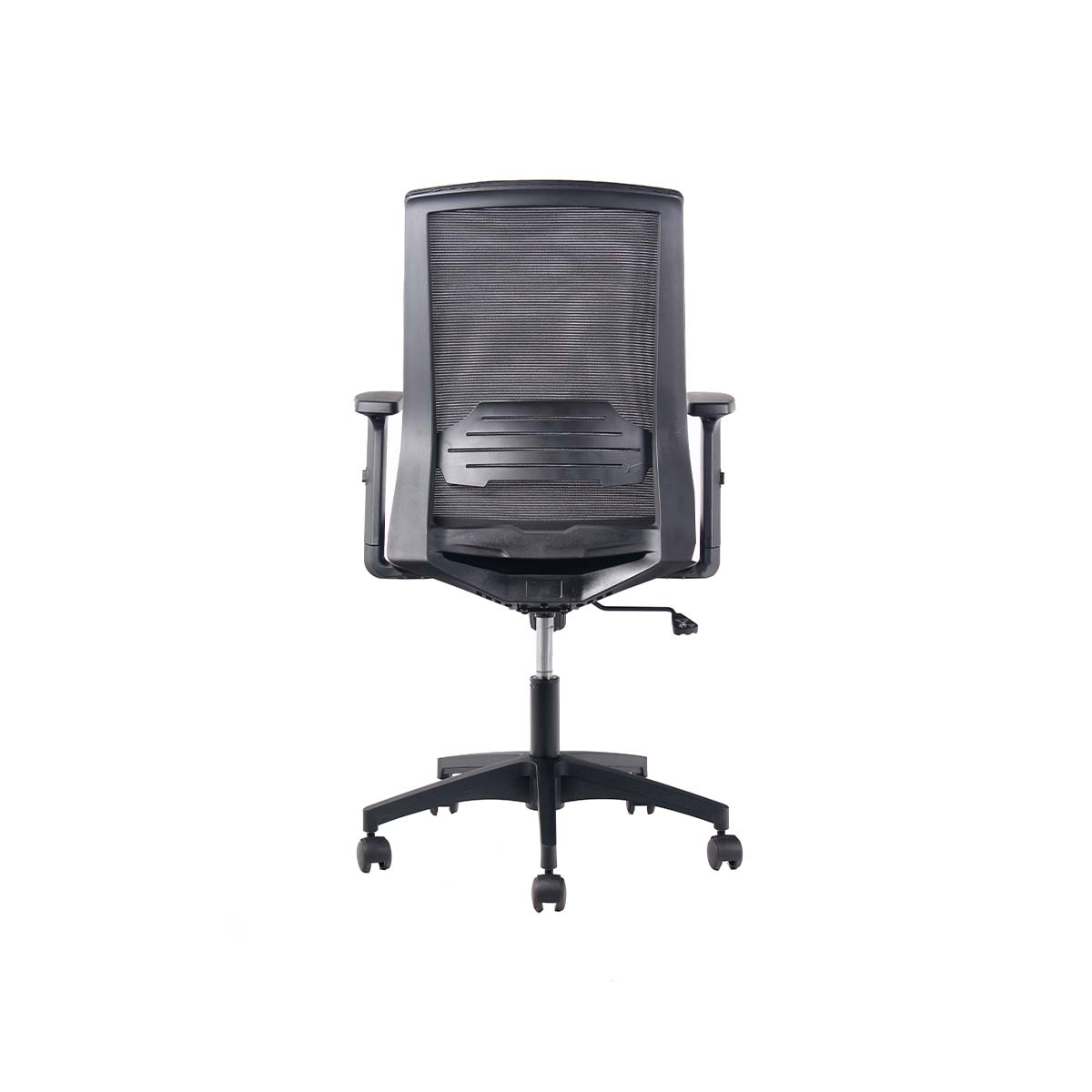 Respaldo de malla negra con soporte lumbar fijo y apoyabrazos de PU graduables en altura, ángulo y profundidad (3D).