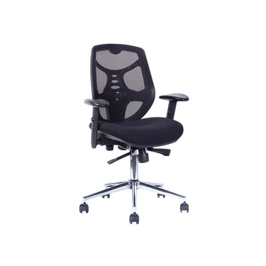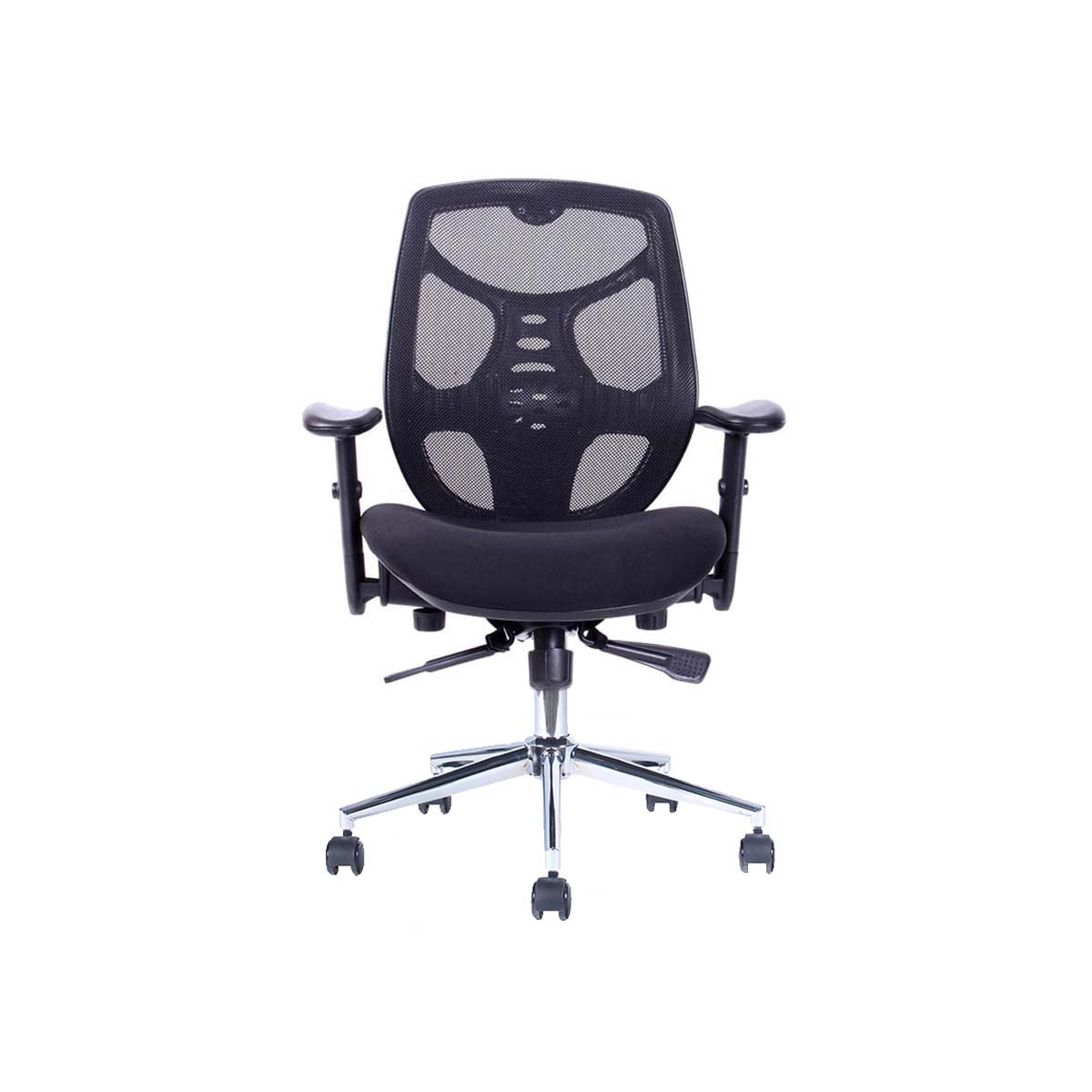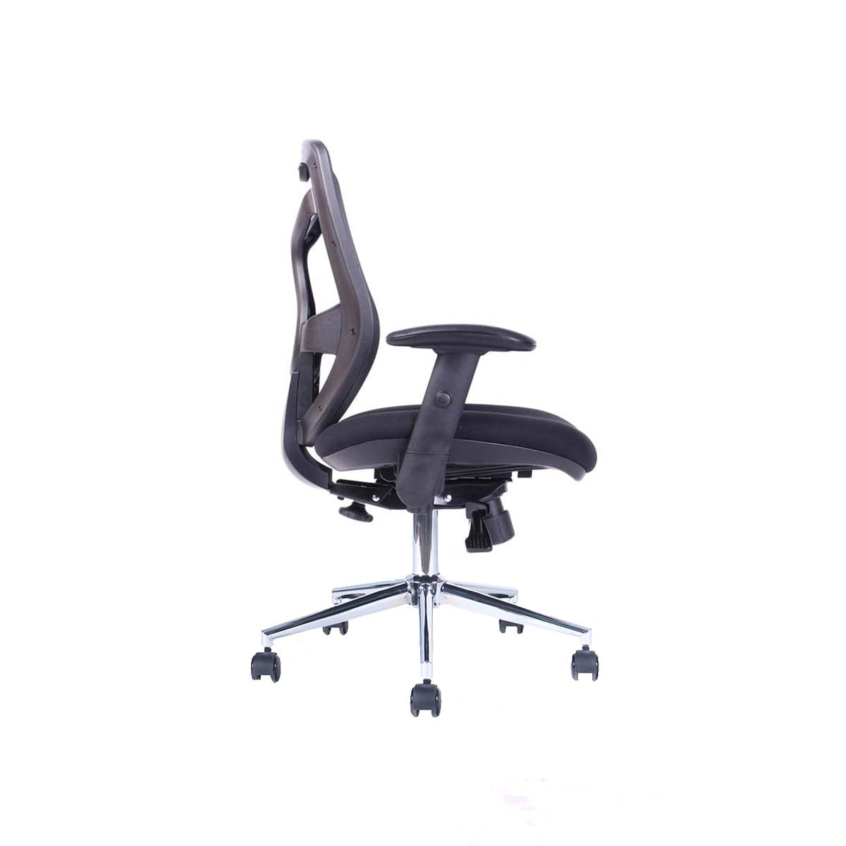 Respaldo de malla y soporte lumbar fijo. Apoyabrazos de PU graduables en altura (1D).