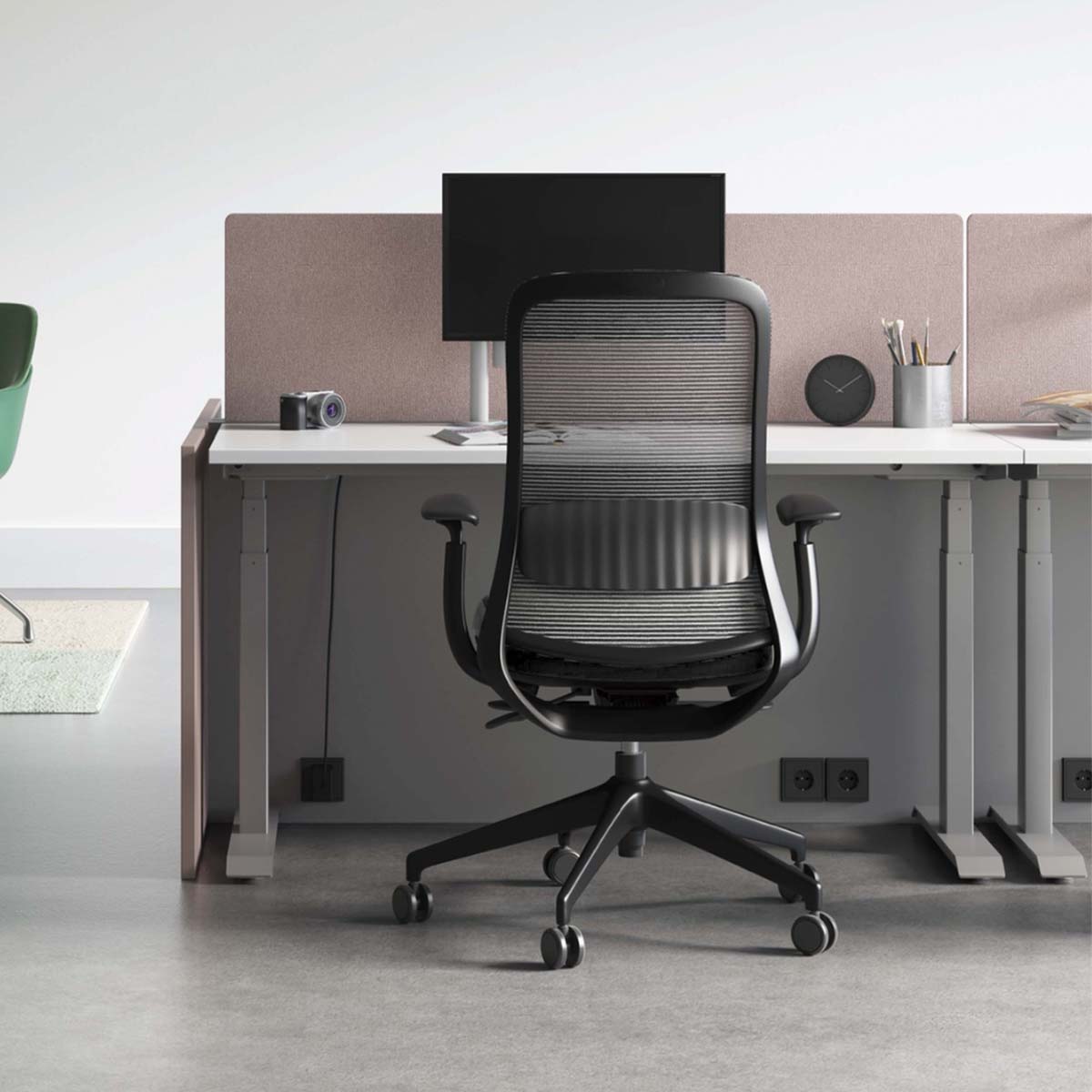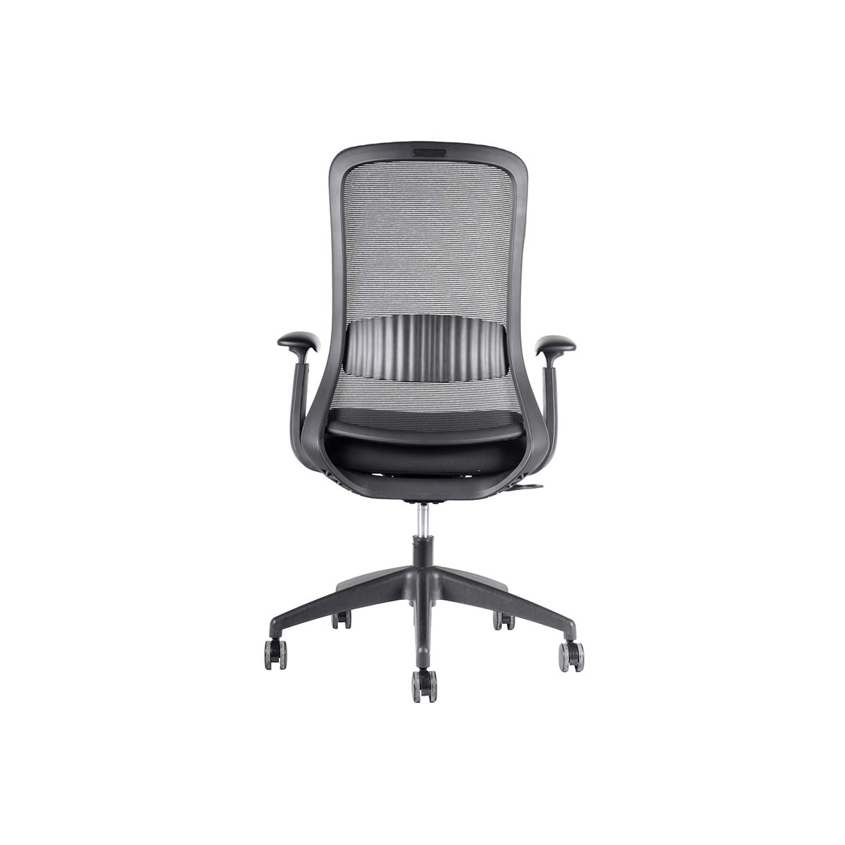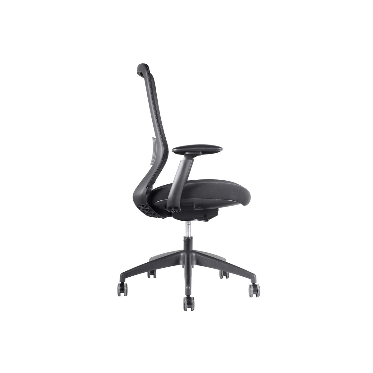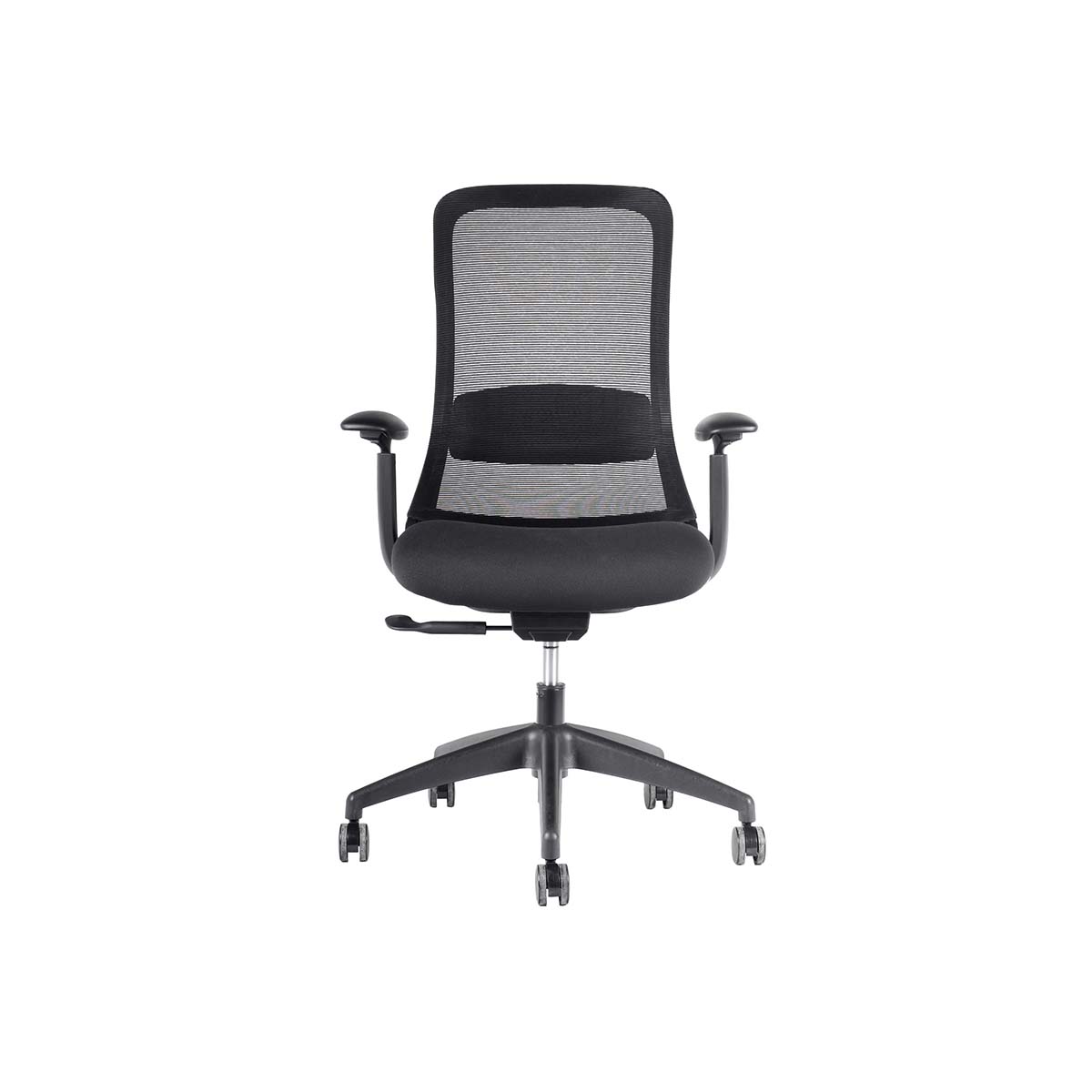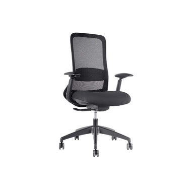 Respaldo de malla con soporte lumbar fijo. Apoyabrazos de PU ajustables en altura, ángulo y profundidad (3D).