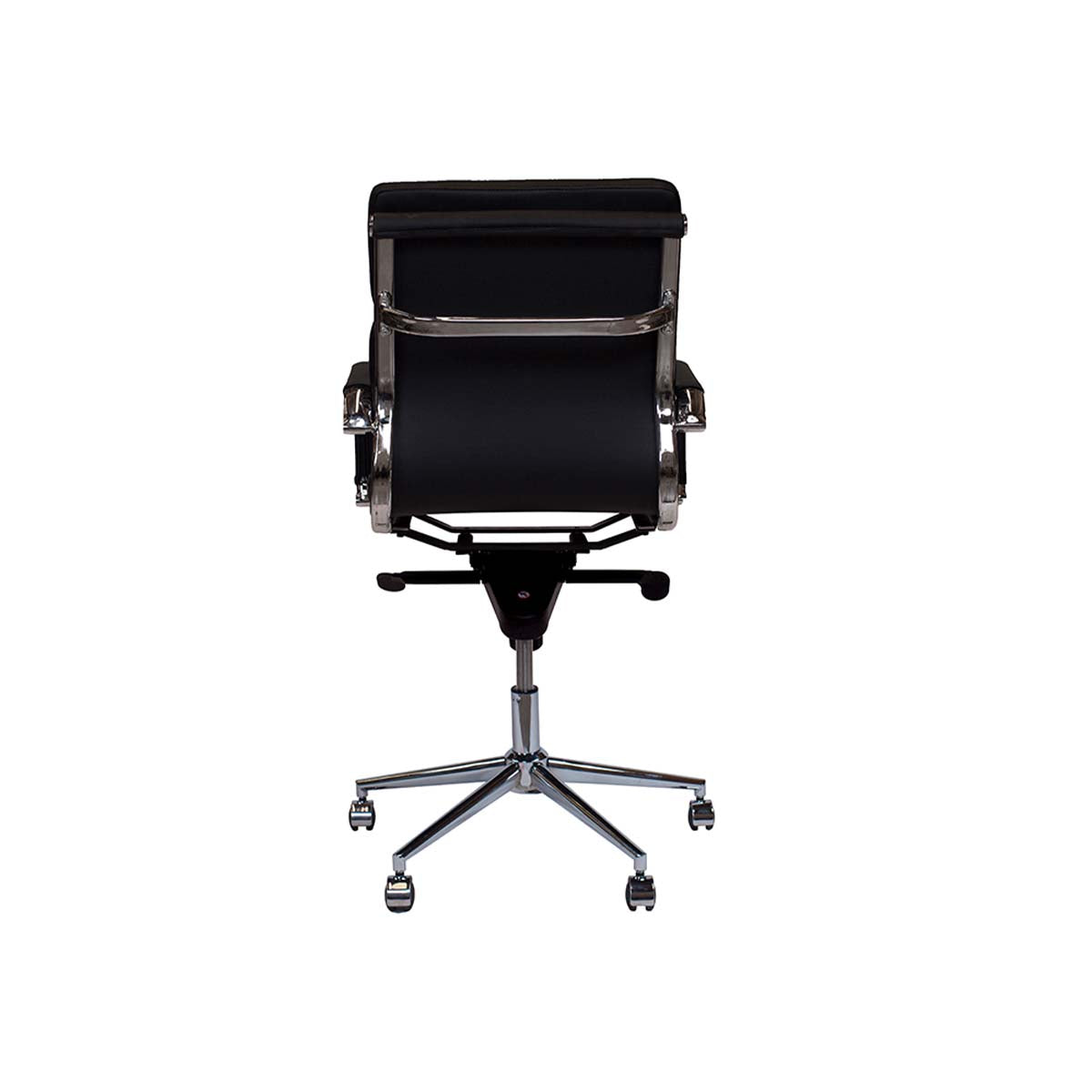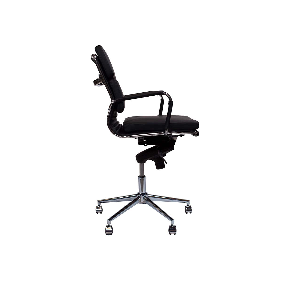 Silla de oficina con respaldo bajo, fabricada en una sola pieza tapizada en PU asiento y respaldo, diseño bordado con espuma de alta densidad, su curvatura en la zona lumbar sirve de apoyo. Mecanismo centro adelantado giratorio. Regulación de altura mediante pistón de gas. Apoya brazos cromados fijos. Base estrella de acero cromado con ruedas de 50 mm.