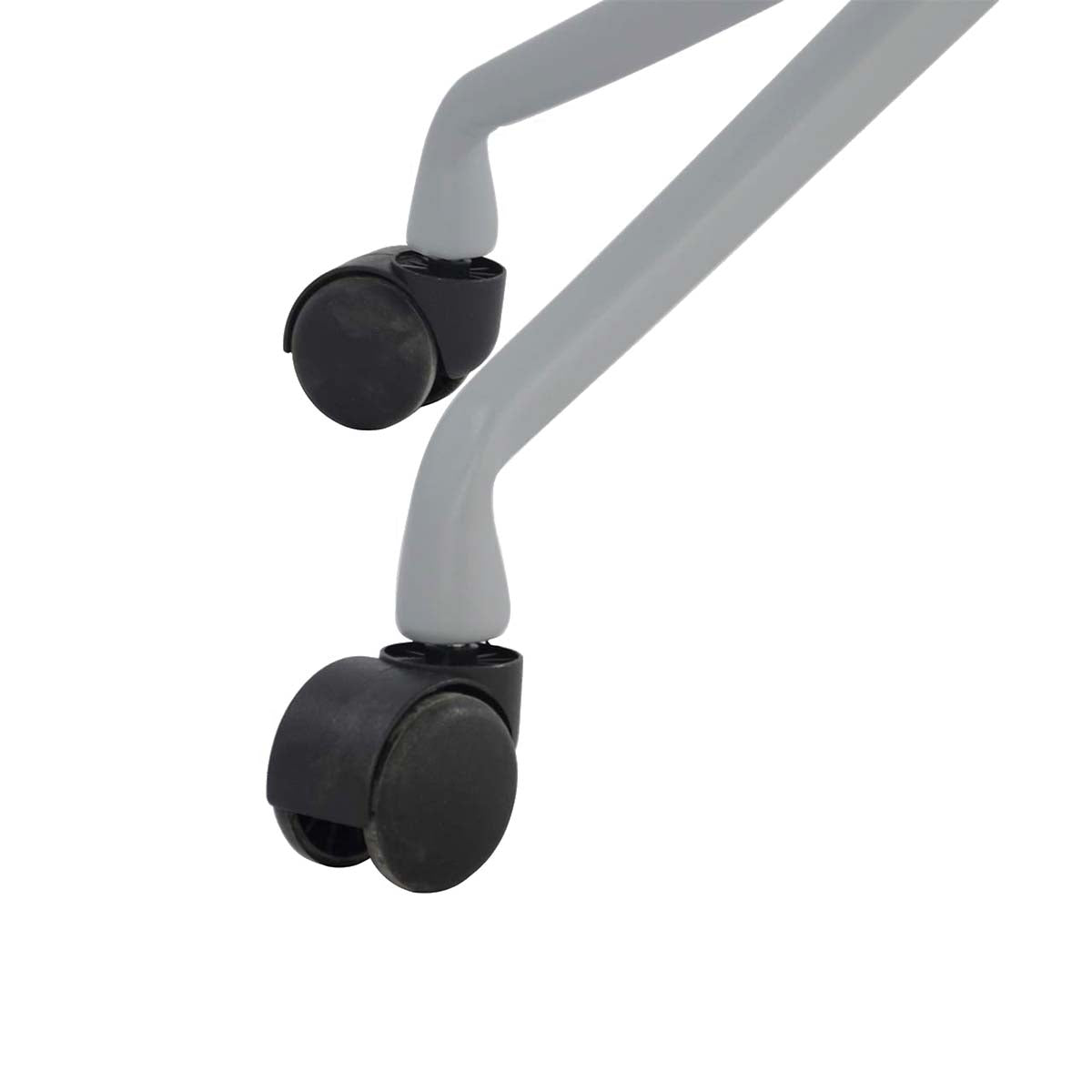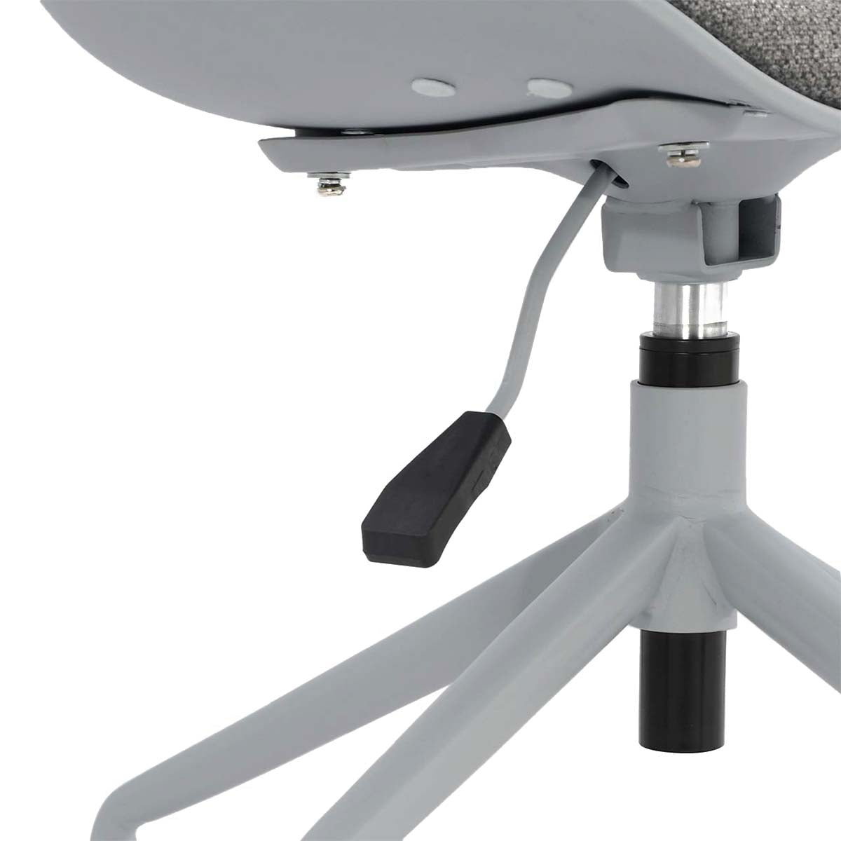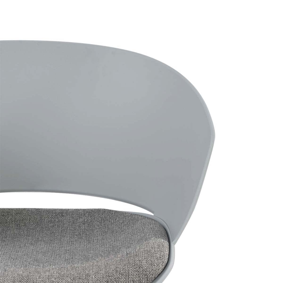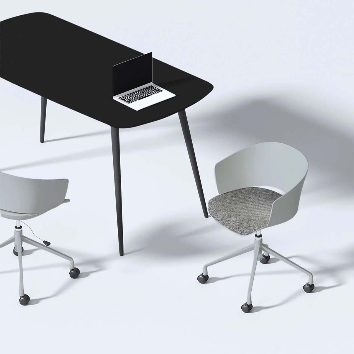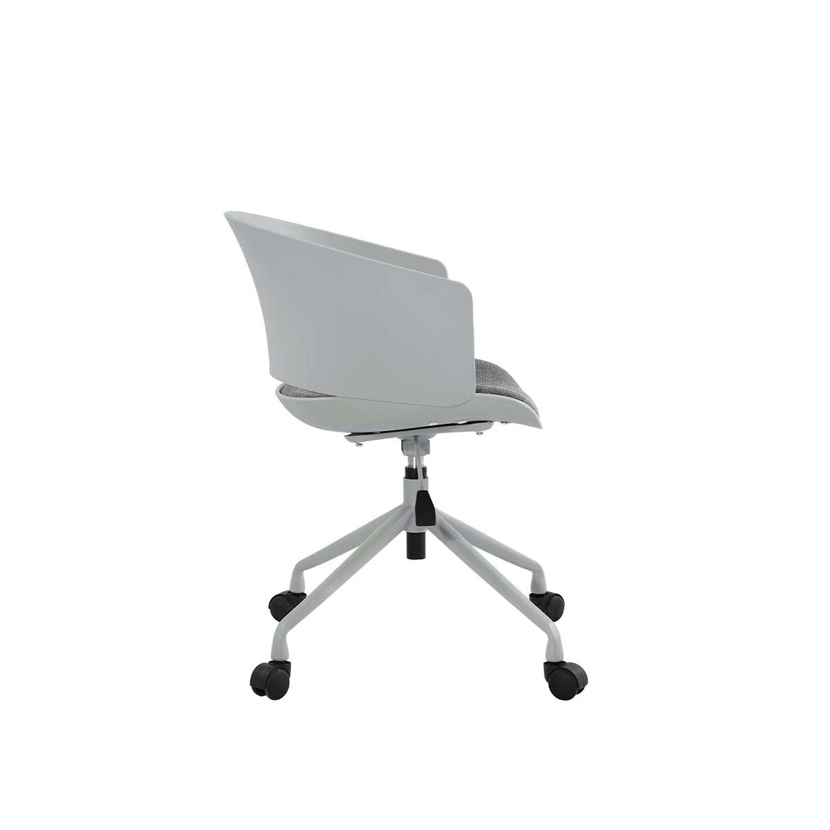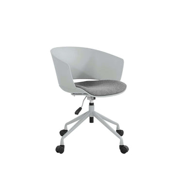 Silla de escritorio con base metálica lacada, ruedas de PVC, asiento de polipropileno inyectado y cojín de espuma tapizado en tela.