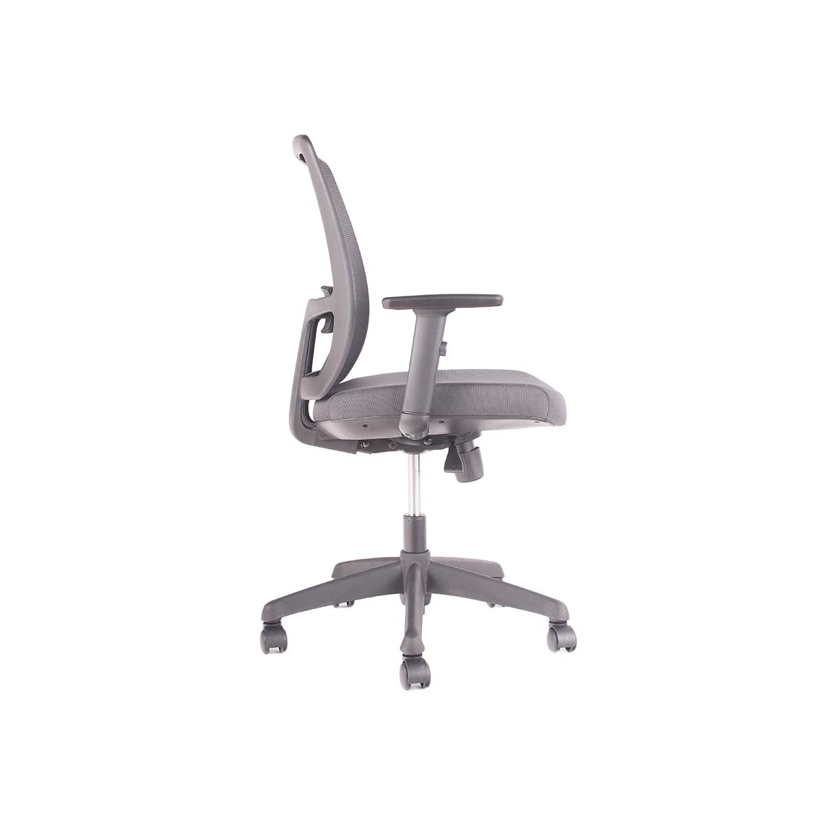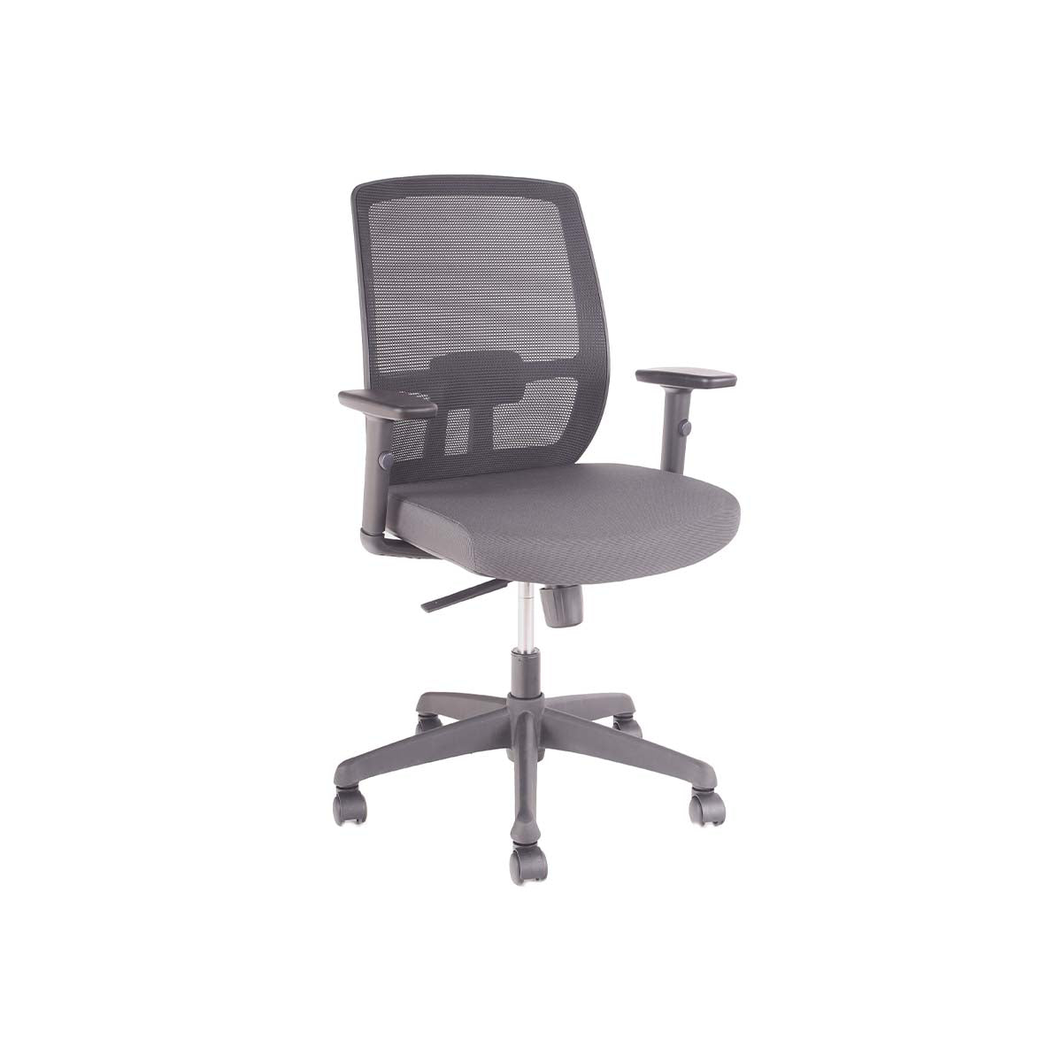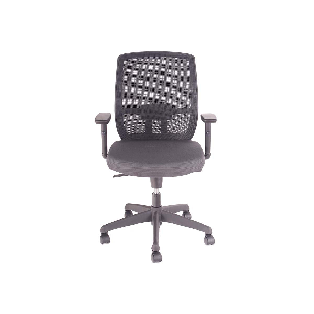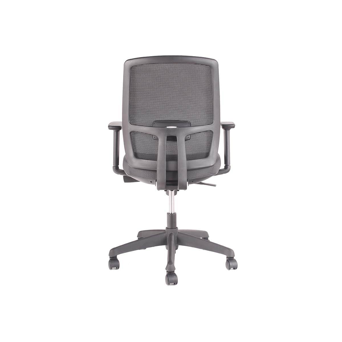 Respaldo de malla con soporte lumbar ajustable en profundidad. Apoyabrazos de PU graduables en altura, ángulo y profundidad (3D).